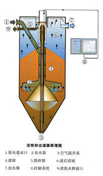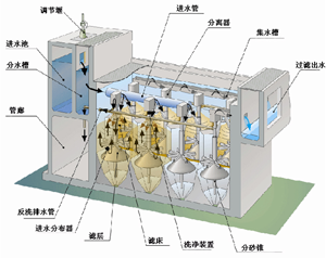 开云手机官方网站采用逆流原理,污水由设备上部进入分配管并由安装在设备底部的分水器分水,向上流经滤床而被过滤,然后由开云手机官方网站上部的滤液出水口流出。被滤砂截留的杂质和滤砂一起从设备锥形底部经滤料提升装置提升至设备顶部的洗砂器内。砂的清洗从被滤料提升装置提升时就开始,在紊流作用下使杂质从砂粒中分离出来。杂质随洗砂水经污水排放口排放,清洗后的砂颗粒(密度高)自由沉降到砂床上。实现水的净化与砂的清洗同时进行的连续过滤过程。